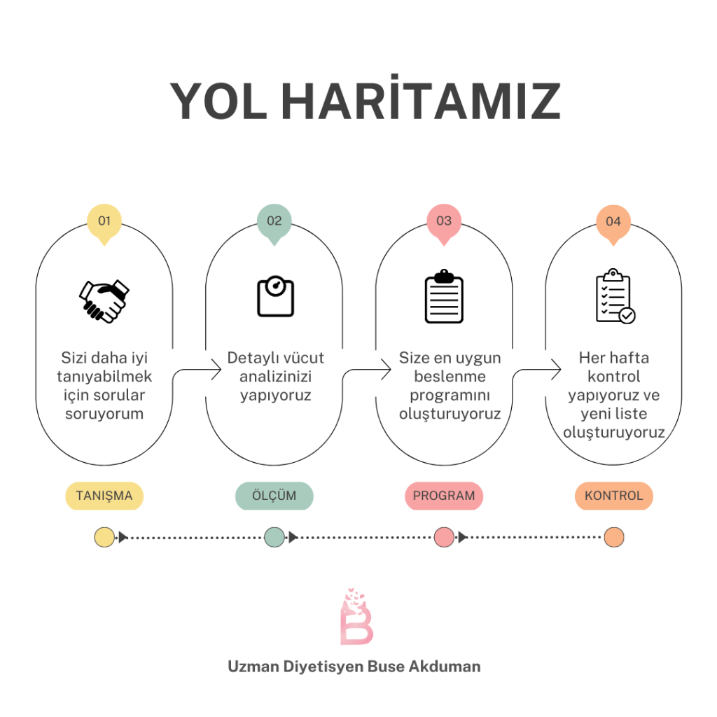 4. Kontrol: Haftalık olarak yüz yüze veya online olarak sizlerle görüşme gerçekleştiriyoruz. Geçen haftayı değerlendiriyoruz. Sürece dair sizden ve vücudunuzdan aldığımız yorumlar ile yeni diyet listesi oluşturuyoruz. Hedefimize ulaşana kadar bu şekilde yolumuza devam ediyoruz.